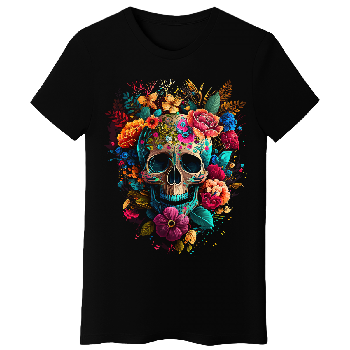Koszulka Damska Czaszka W Kwiatach - Czarna